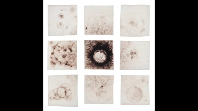 Borosilicate glass, blown glass, embroidery hoops, LED light, plywood